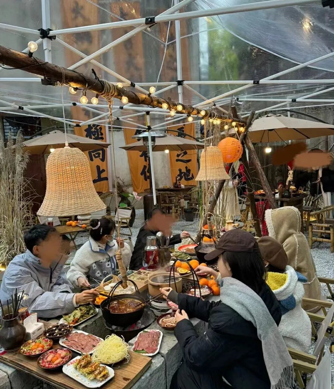 它和圍爐煮茶一樣,主打氛圍感,鍋具被粗麻繩吊在半空,石塊或紅磚還原火塘造型,上面擺放著各式配菜,再搭配上露營風格的裝飾、暖黃的氛圍燈,滿滿的閑適、野性感就出來了。