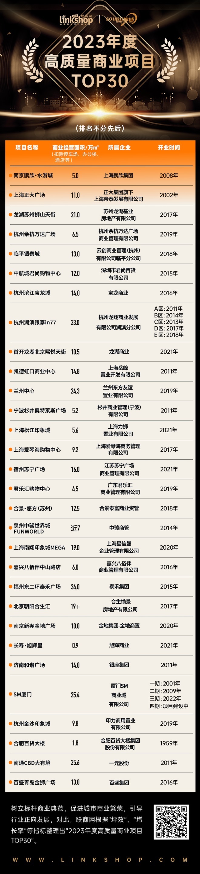 為樹立標桿商業(yè)典范,促進城市商業(yè)繁榮,引導(dǎo)行業(yè)正向發(fā)展,聯(lián)商網(wǎng)根據(jù)“坪效”、“增長率”等指標整理出《2023年度高質(zhì)量商業(yè)項目TOP30》榜單。