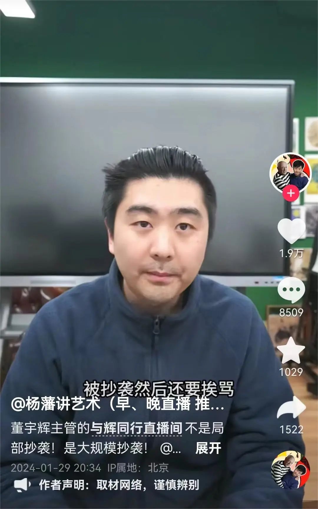 近日,百萬(wàn)粉絲博主“楊藩講藝術(shù)”在抖音平臺(tái)發(fā)布兩條視頻,聲稱與輝同行直播間抄襲自己的文案。在抖音,楊藩講藝術(shù)擁有235萬(wàn)粉絲。