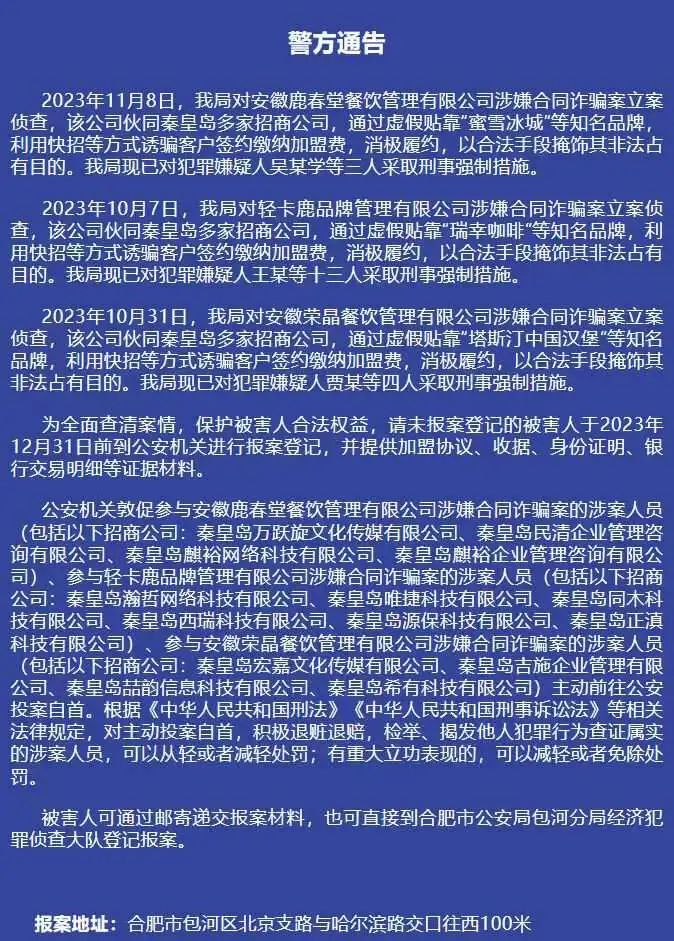 合肥包河區(qū)警方通告顯示,輕卡鹿品牌管理有限公司、安徽鹿春堂餐飲管理有限公司、安徽榮晶餐飲管理有限公司。利用快招等方式誘騙客戶簽約繳納加盟費,消極履約,以合法手段掩飾其非法占有目的,涉嫌合同詐騙。被立案偵查,相關(guān)犯罪嫌疑人已采取強制措施。