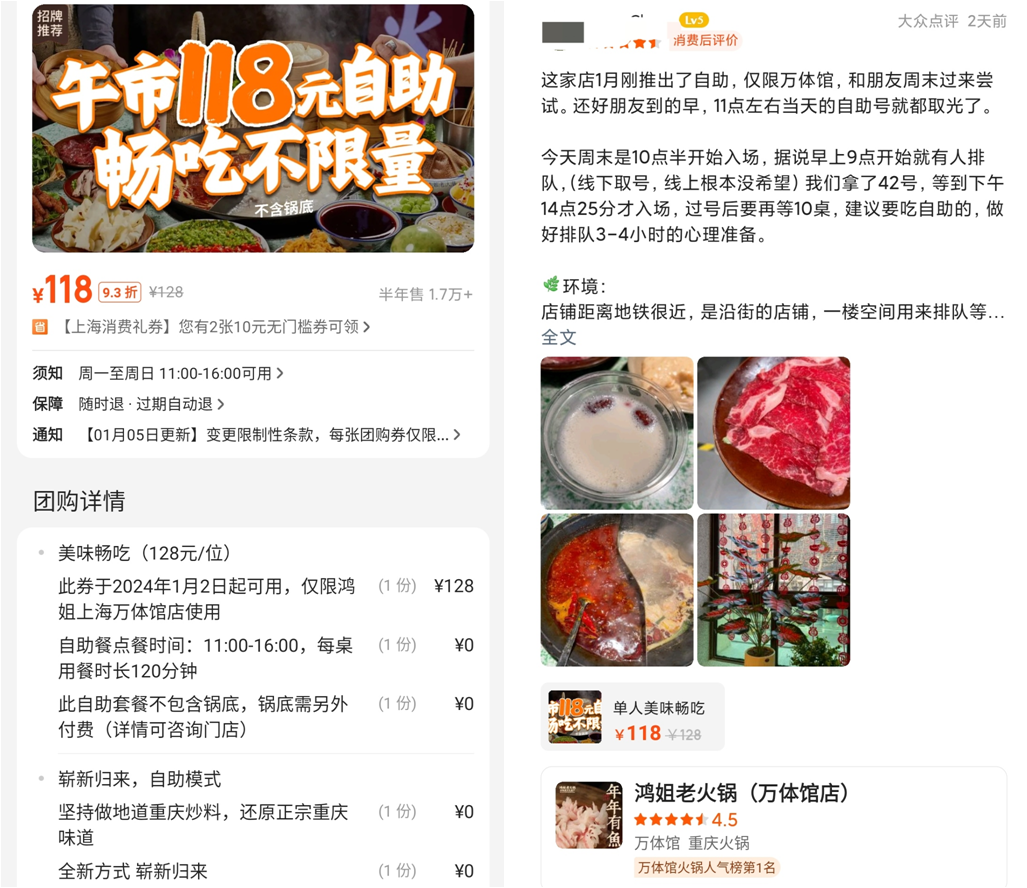 且不說(shuō)海底撈出爾反爾是不是另有隱情,“午市自助”確實(shí)成為火鍋品牌翻紅的一大法寶。今年1月初,鴻姐老火鍋上海萬(wàn)體館店上線單人118元午市自助餐,截至1月31日銷(xiāo)售超1.7萬(wàn)件。此外,哥老官火鍋也傳出售賣(mài)自助午餐的消息。