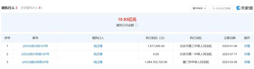 近日,陸正耀又新增了一則被執(zhí)行人信息,執(zhí)行標(biāo)的781.78萬元,執(zhí)行法院為北京市第三中級人民法院,并且此前,陸正耀多次成被執(zhí)行人并被限制消費,根據(jù)【天眼查數(shù)據(jù)顯示】,目前陸正耀共關(guān)聯(lián)3則被執(zhí)行人信息,被執(zhí)行總金額超10.9億元。