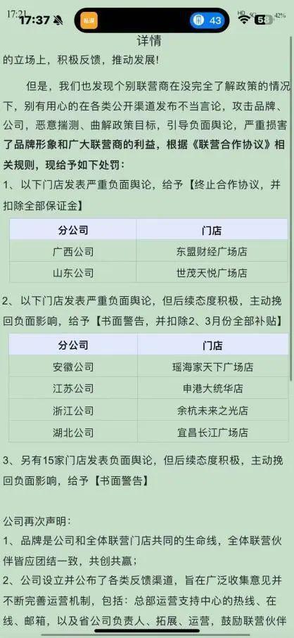 然而,庫迪的改變,與其說是意識到了問題的存在,不如說是在“民意”裹挾下的不得已而為之。諷刺的是,近日網(wǎng)上流傳的一張截圖顯示,疑似部分聯(lián)營商還因為吐槽被庫迪處罰。