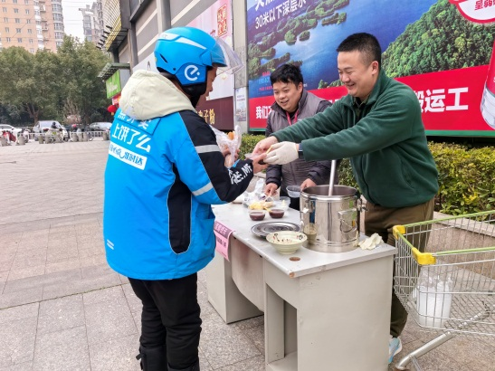 在浙江寧波,多家門店設(shè)立了“愛心粥領(lǐng)取點(diǎn)”,志愿者們將精心烹制、熱氣騰騰的暖心粥送到外賣員、快遞員、環(huán)衛(wèi)工人等戶外工作者手中,提醒他們注意防寒、保重身體,將“萬家”關(guān)愛傳遞到“萬家人”手中。