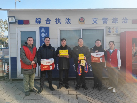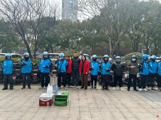 在江蘇,蘇州園區(qū)店志愿者帶著熬煮的姜茶和暖心小禮包,來到星湖街蜂鳥配送站點(diǎn),給餓了么騎手們送上關(guān)愛。無錫濱湖店志愿者們帶著暖心小禮包,為隱秀路環(huán)衛(wèi)工人、榮巷街道綜合執(zhí)法隊(duì)員送上萬家人的一份心意。