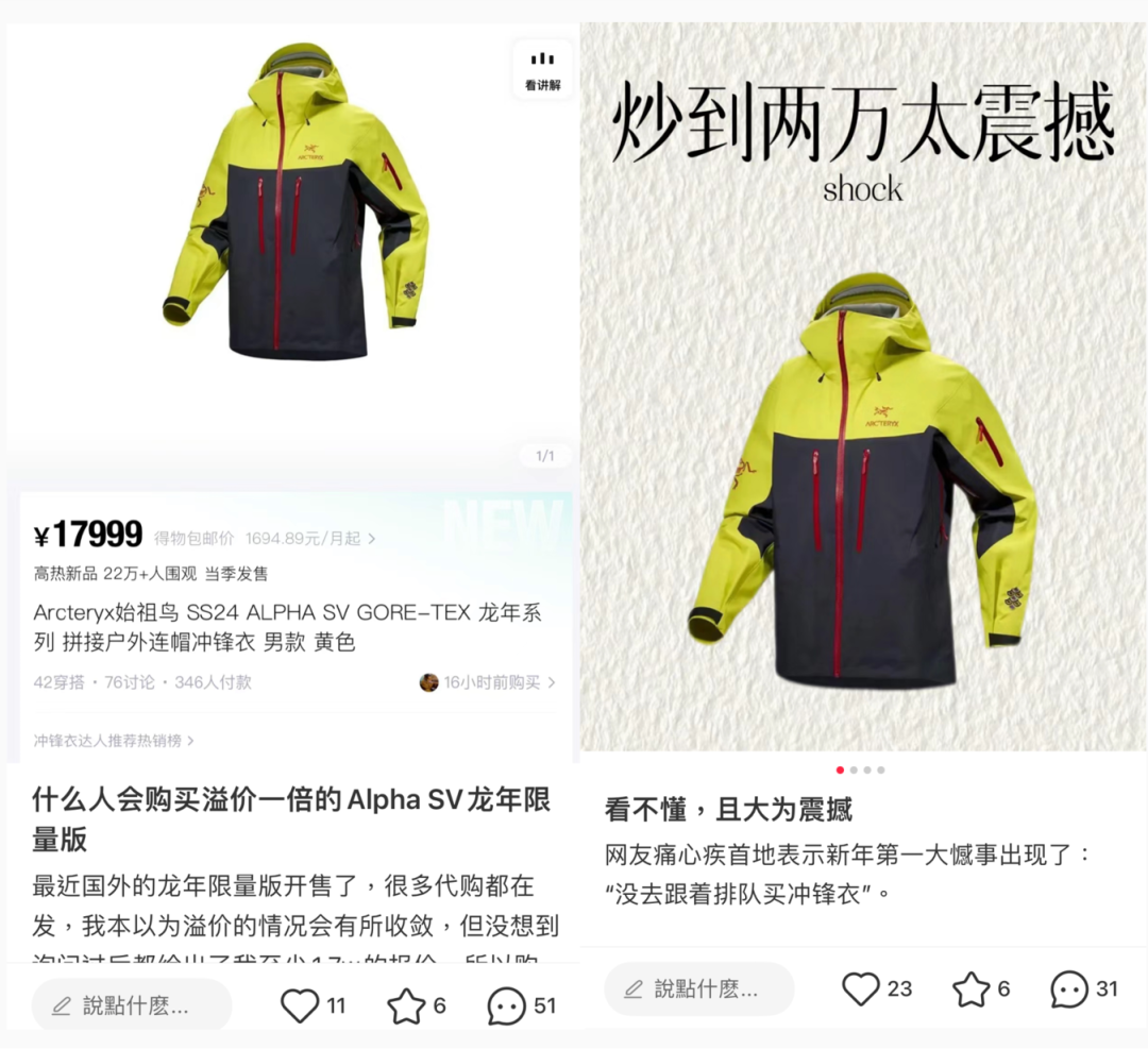 一通操作下來,始祖鳥成了炙手可熱的時(shí)尚單品,“龍年限定”沖鋒衣即便被調(diào)侃是美團(tuán)小哥同款,但依然攔不住有人愿意去門店排隊(duì)3個(gè)多小時(shí),甚至在二手平臺(tái)以1.6萬元的高價(jià)含淚拍下[15]。