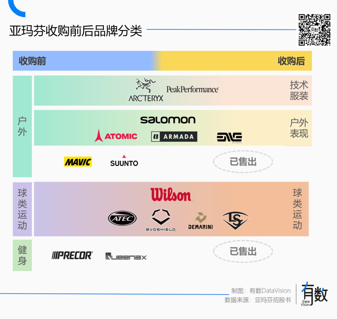 到了2018年被安踏收購前夕,亞瑪芬手握15個(gè)品牌,涵蓋多個(gè)運(yùn)動(dòng)類別,從網(wǎng)球、棒球、高爾夫、攀巖到滑雪,無一不是專業(yè)圈子里的頂級(jí)品牌。