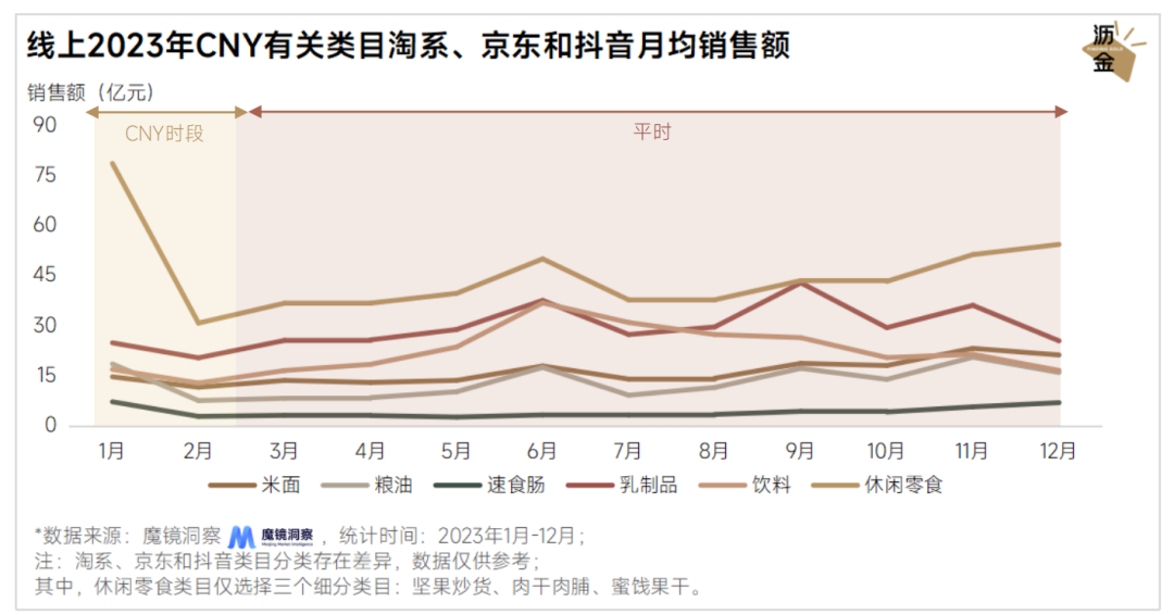 米面、糧油、飲料在線上多為囤貨屬性,年貨節(jié)期間線上銷售與平時差異不大。