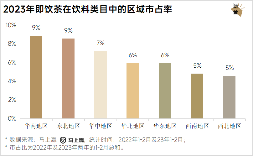 從地區(qū)銷售來看,華南、東北地區(qū)市占率領跑全國。這可能是因為華南地區(qū)茶文化歷史悠長、受眾廣,而東北地區(qū)正處于集中供暖時期,潤燥解渴的即飲茶更受青睞。
