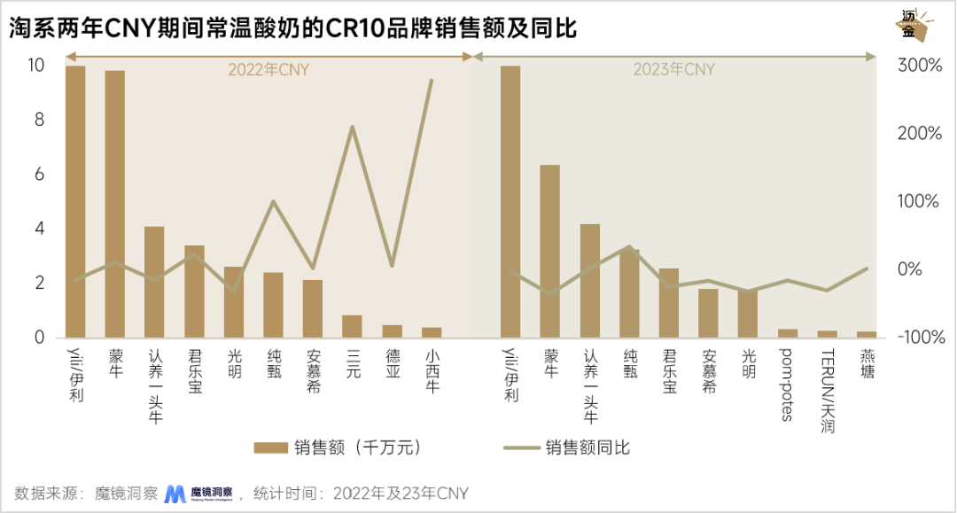 淘系兩年CNY期間常溫酸奶的CR10品牌銷售額及同比