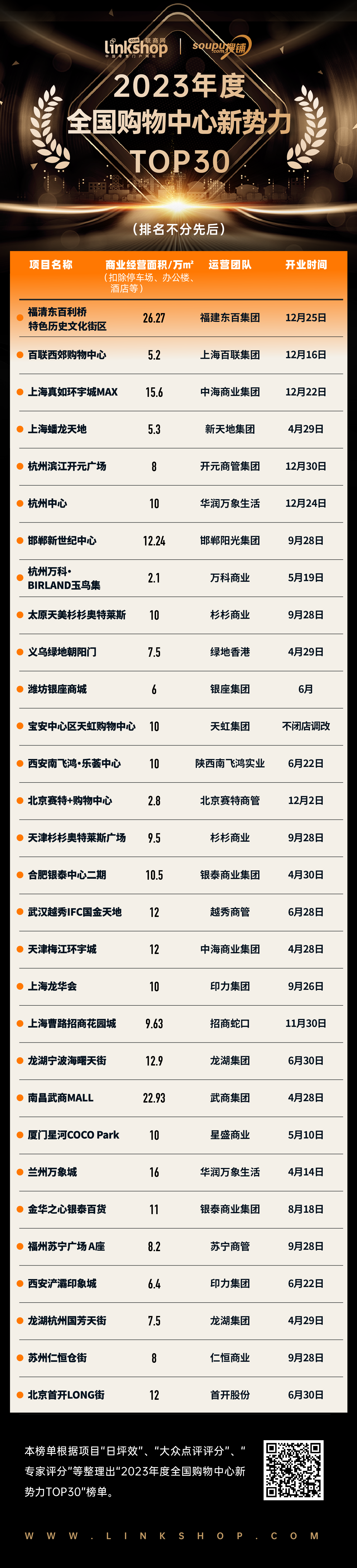 《聯商網》聚焦2023年新開商業(yè)項目,根據日坪效、大眾點評評分等緯度,邀請專家評委評選出《2023年度全國購物中心新勢力TOP30》榜單,樹立標桿商業(yè)典范,促進城市商業(yè)繁榮,引導行業(yè)正向發(fā)展。