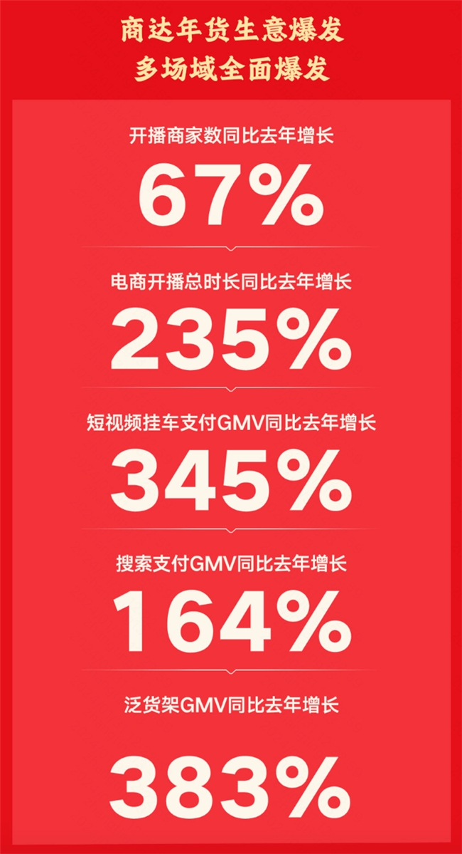 此外,2024快手商城年貨節(jié),開播商家數(shù)較上一年貨節(jié)增長67%,電商開播總時長較上一年貨節(jié)增長235%。短視頻、搜索、泛貨節(jié)三個場域表現(xiàn)亮眼,短視頻掛車支付GMV較上一年貨節(jié)增長345%,搜索支付GMV較上一年貨節(jié)增長164%,泛貨架GMV較上一年貨節(jié)增長383%,“內(nèi)容場+貨架場”雙輪驅(qū)動增長,向商家經(jīng)營釋放更多新機遇。