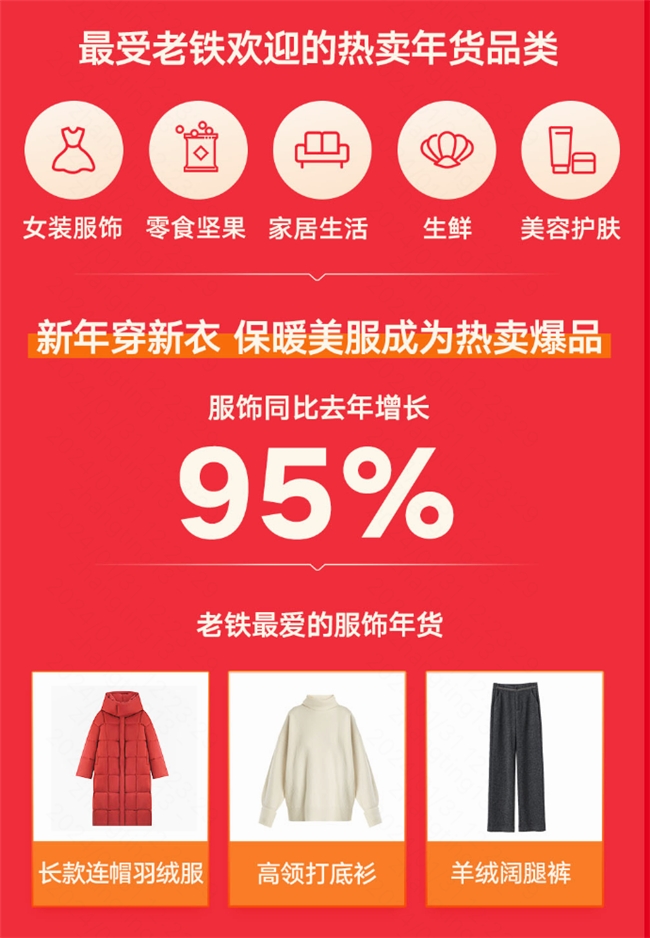 添置新衣辭舊迎新是很多人過年的儀式感,保暖美服成為2024快手商城年貨節(jié)熱賣爆品,服飾行業(yè)較上一年貨節(jié)增長95%。長款連帽羽絨服、高領打底衫、羊絨闊腿褲是老鐵最愛的服飾年貨。