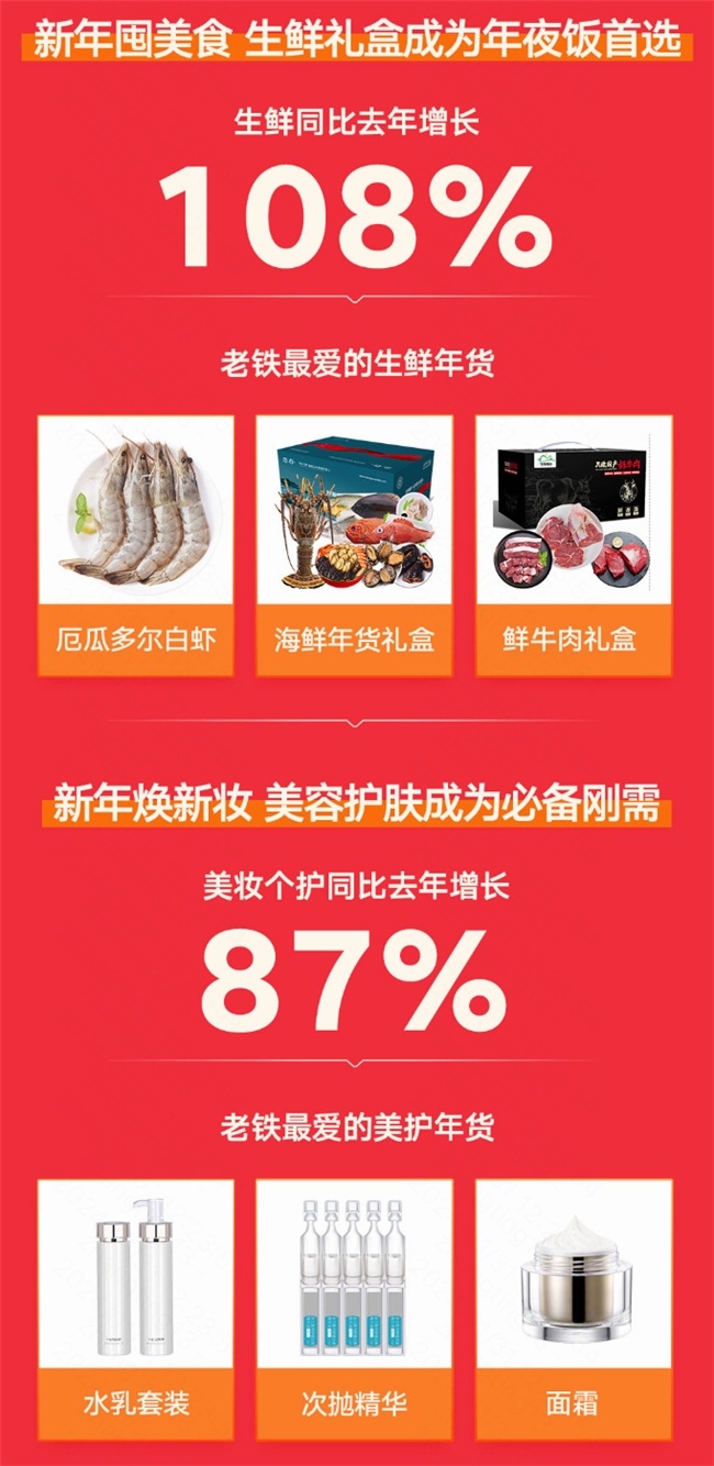 春節(jié)的飯桌上少不了豐盛的美味佳肴,生鮮禮盒是老鐵們的年夜飯首選,今年年貨節(jié),快手電商生鮮行業(yè)較上一年貨節(jié)增長108%。各式生鮮年貨中,厄瓜多爾白蝦、海鮮年貨禮盒、鮮牛肉禮盒最受老鐵喜愛。