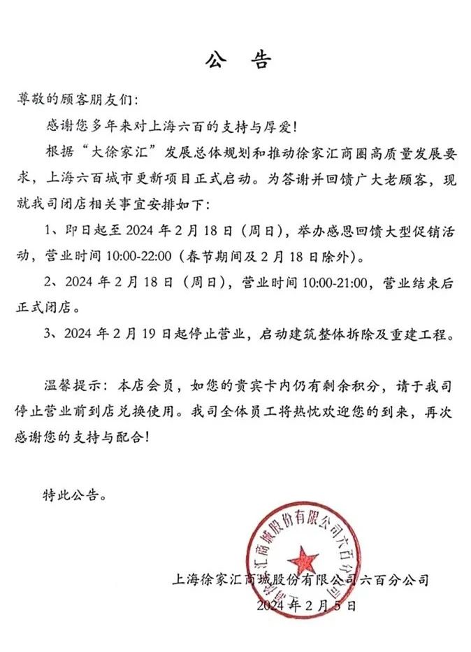 即日起至 2024年2月18日,舉辦感恩回饋大型促銷(xiāo)活動(dòng),營(yíng)業(yè)時(shí)間10:00-22:00(春節(jié)期間及2月18日除外);2024年2月18日,營(yíng)業(yè)結(jié)束后正式閉店;2024年2月19日起停止?fàn)I業(yè),啟動(dòng)建筑整體拆除及重建工程。