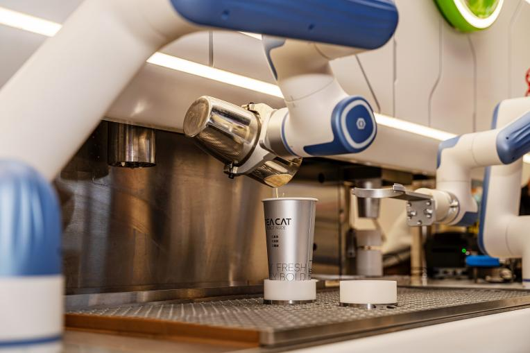 此外,庫迪方面告訴壹覽商業(yè),機(jī)械臂操作不僅能夠保證配方配比,穩(wěn)定產(chǎn)品出品標(biāo)準(zhǔn),提高品控,還能有效提升衛(wèi)生質(zhì)量,讓消費(fèi)者體驗(yàn)更好。而人機(jī)協(xié)作也提供一種新思路:只要原料充足,且機(jī)器設(shè)備維護(hù)得當(dāng),茶貓極有可能實(shí)現(xiàn)7*24小時(shí)無間斷工作,甚至完成無人售賣。