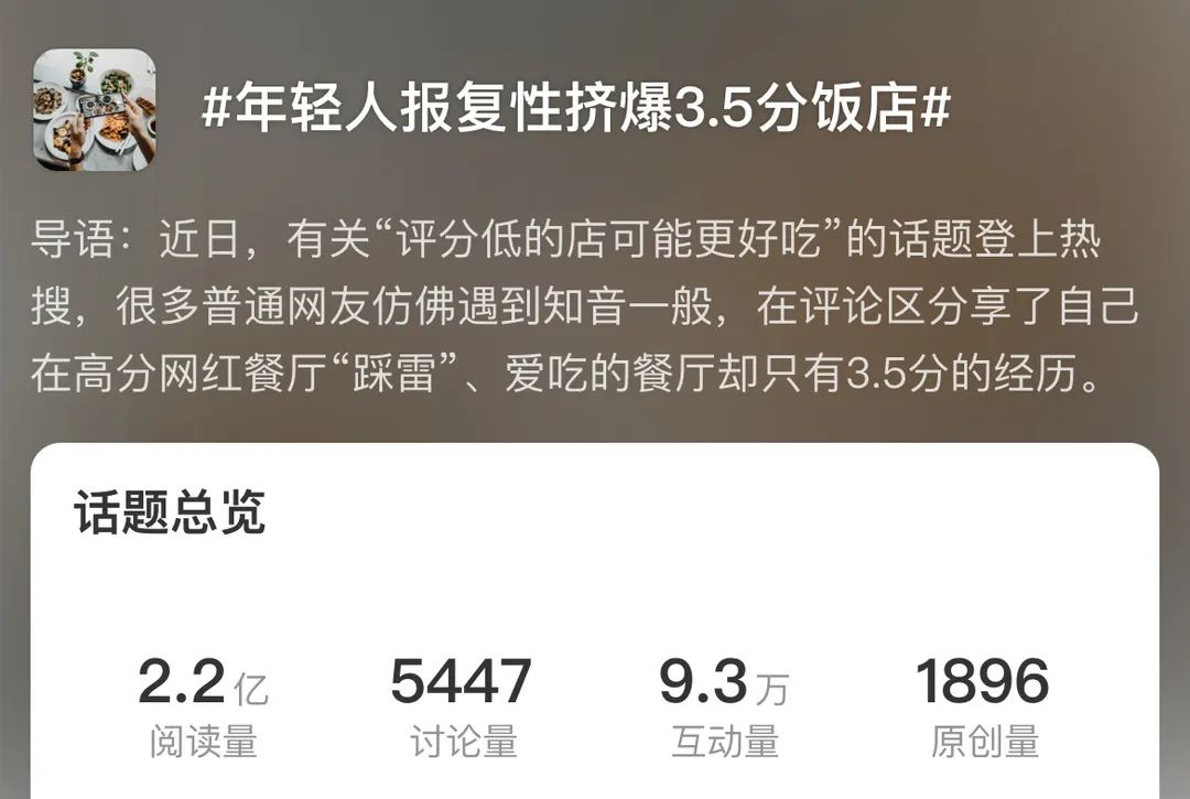 然而另一邊,3.5分飯店的熱度高漲卻令人啼笑皆非。年輕人深諳各大平臺刷分刷好評的潛規(guī)則,開始反其道而行之,以一種反叛心理探尋實則是平臺評分“普通水平”、但被熱點包裝成低分的3.5分餐廳。