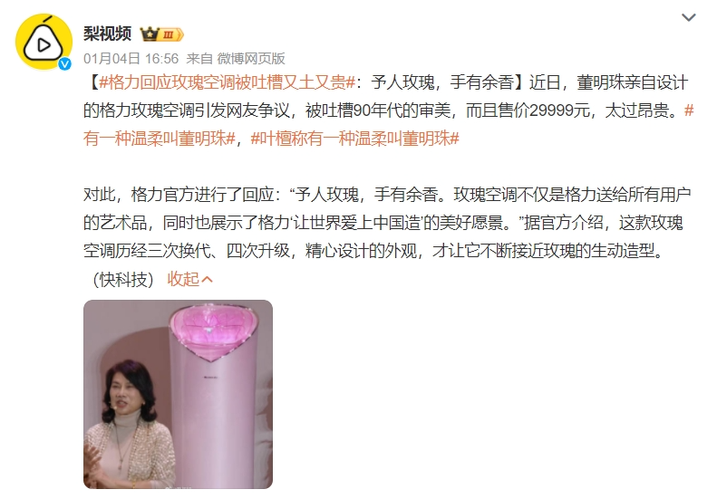 格力的“網(wǎng)紅”氣質(zhì)還體現(xiàn)在一系列“博人眼球”的新品。其中最典型的或許就是董明珠參與設(shè)計的玫瑰系列空調(diào),被網(wǎng)友嘲諷“90年代審美”、“又丑又土又貴”。值得一提的是,格力官方對此回應(yīng)道,該款空調(diào)是歷經(jīng)三次換代、四次升級的藝術(shù)品。