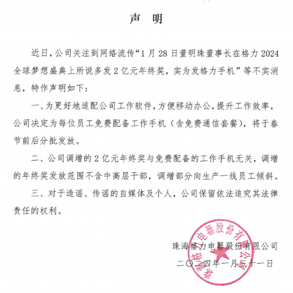 但是,事后有自媒體爆料稱,2億年終獎并不是現(xiàn)金,而是用格力G3手機和網(wǎng)上商城積分抵扣;格力方面也隨即發(fā)布官方聲明進行辟謠,稱“2億年終獎實為格力手機”是不實報道。