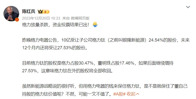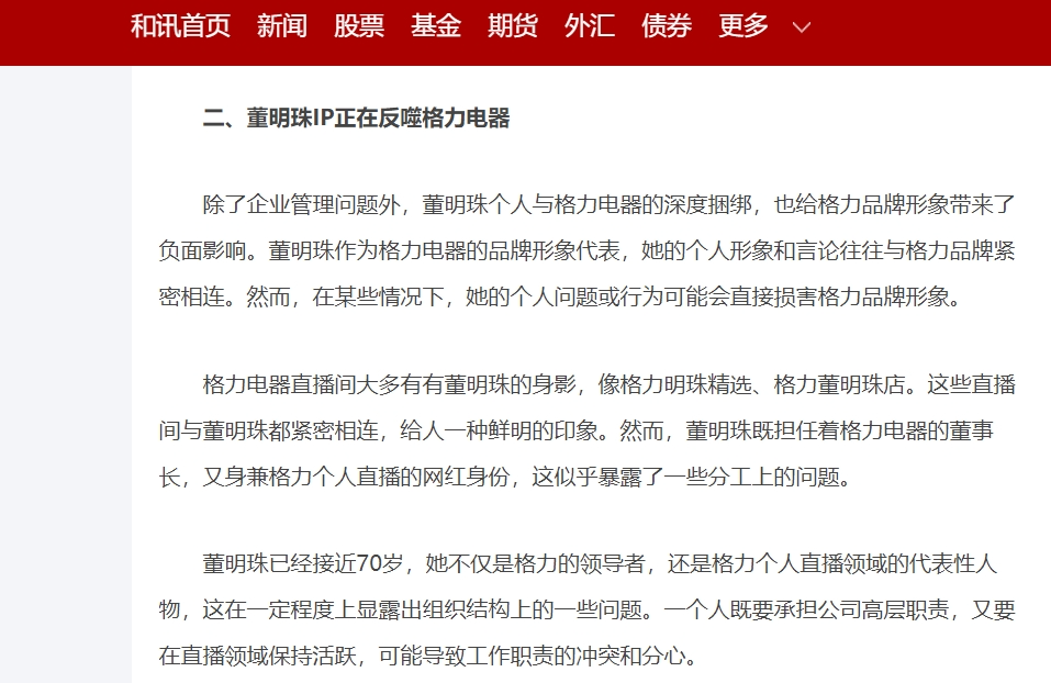然而,自2023年以來,圍繞在董明珠個人身上的爭議話題多次出現(xiàn),對格力的品牌形象也可能會形成一定的負面影響;和訊網(wǎng)此前就曾報道稱“董明珠IP正在反噬格力電器”。