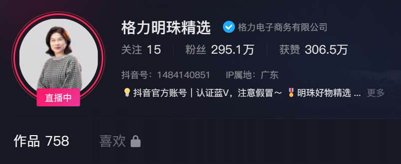 不過,格力熱度最高的直播賬號還是此前由孟羽童主導(dǎo)、董明珠深度參與的“明珠羽童精選”抖音直播間(在孟羽童離職后更名為“格力明珠精選”),截至目前已經(jīng)積累近300萬粉絲。