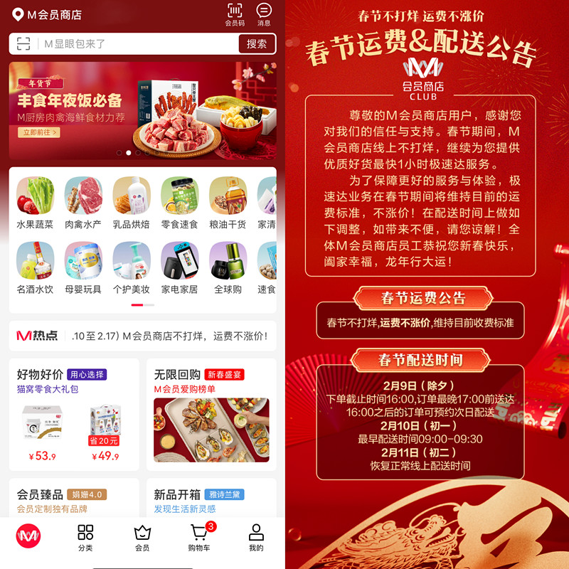 近日,M會(huì)員商店宣布春節(jié)不打烊,線上運(yùn)費(fèi)不漲價(jià)。