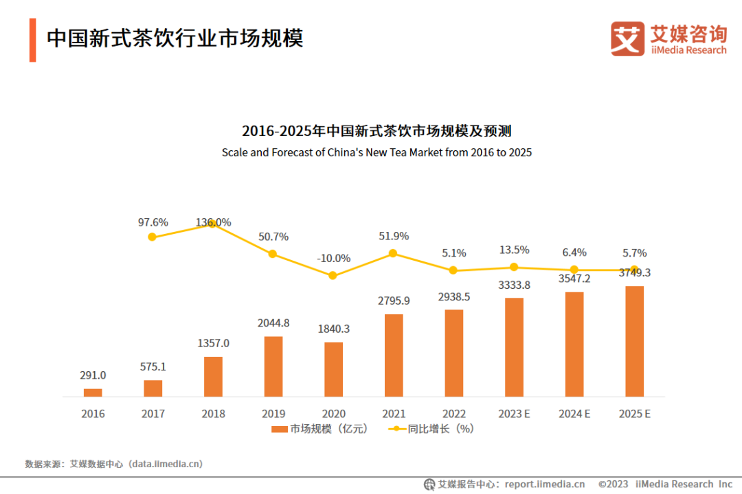 這背后顯然有著新茶飲市場已逐漸觸及天花板的影響。根據(jù)艾媒咨詢數(shù)據(jù)顯示,2022年我國新茶飲市場規(guī)模為2938.5億元,預(yù)計(jì)到2025年將增長到3749.3億元。雖說規(guī)模仍在上漲,但增速下滑明顯。
