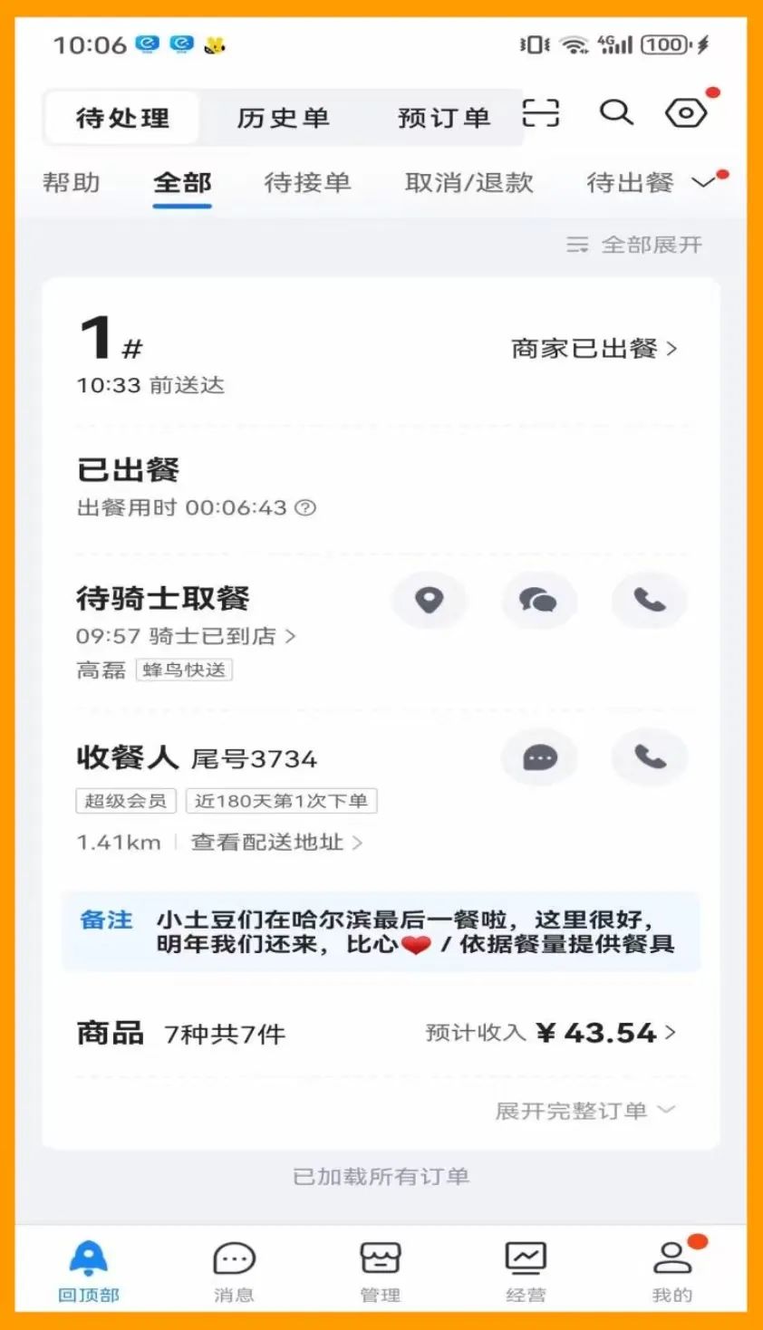他印象最深的一次是1月初,一位顧客備注“小土豆們?cè)诠枮I的最后一餐,這里很好,明年我們還來”,接著顧客打了一個(gè)電話稱自己著急趕飛機(jī),曲佳明自己開車送了這一單。