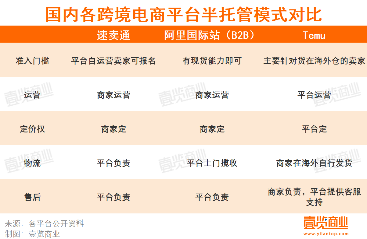 壹覽商業(yè)總結(jié)了目前已推出半托管模式的三大國(guó)內(nèi)電商平臺(tái)發(fā)現(xiàn),各平臺(tái)的半托管模式對(duì)應(yīng)的是不同的跨境電商賣家。與此同時(shí),速賣通、阿里國(guó)際站的半托管主要托管在了前半程,Temu的半托管主要托管在了后半程。