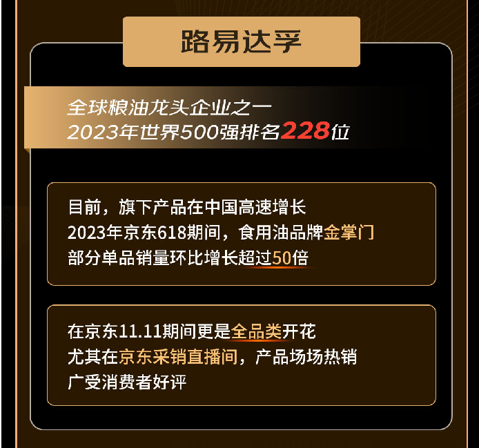 一直以來,路易達(dá)孚發(fā)售的產(chǎn)品備受消費(fèi)者青睞,其于2023年在京東首發(fā)了全新升級(jí)的包裝油品牌金掌門,金掌門玉米胚芽油一度成為爆款單品,在今年京東618期間,食用油品牌金掌門部分單品銷量環(huán)比增長(zhǎng)超過50倍。在京東11.11期間更是全品類開花,尤其在京東采銷直播間,產(chǎn)品場(chǎng)場(chǎng)熱銷,廣受消費(fèi)者好評(píng)。