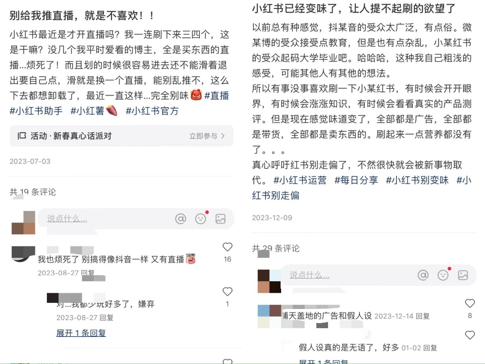 其中,在一條名為“別給我推直播,就是不喜歡”的筆記中,有用戶提到,“小紅書最近才開直播嗎?沒幾個我平時愛看的博主,全是買東西的直播……這么下去都想卸載了”。而這條筆記下也不乏“別搞得像抖音一樣”“我不明白小紅書為什么要向抖學習?更喜歡小紅書的氛圍”“一頁一個直播,真煩”這樣的評論。