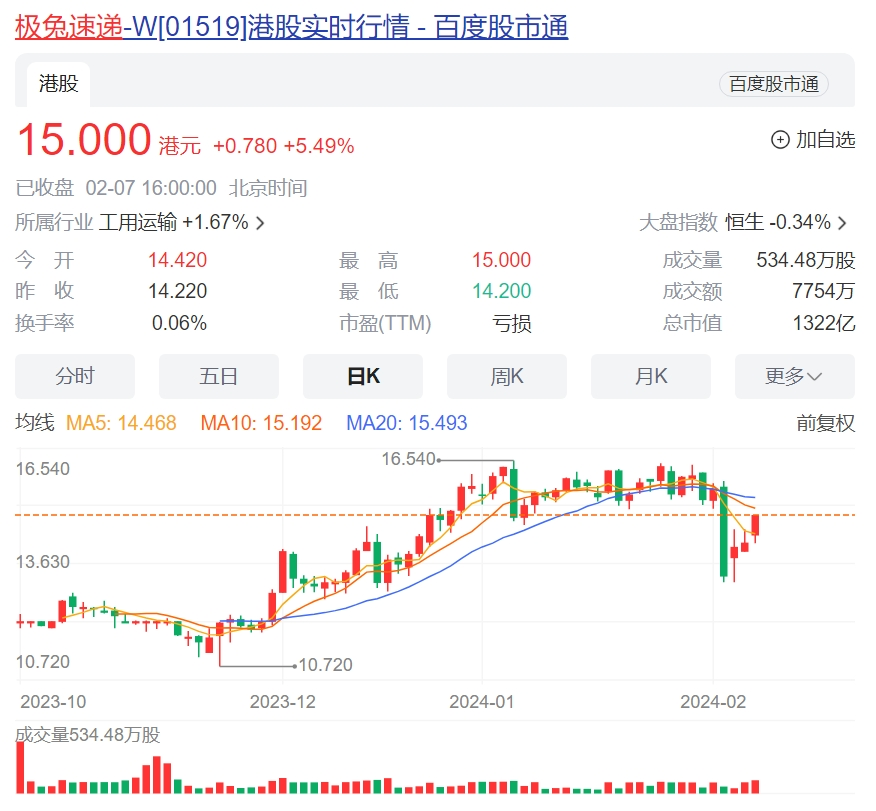 反觀極兔,市值一度超越民營快遞中最賺錢的中通,僅次于順豐,截止2月7日收盤,股價為15.00港元/股,總市值為1322億。