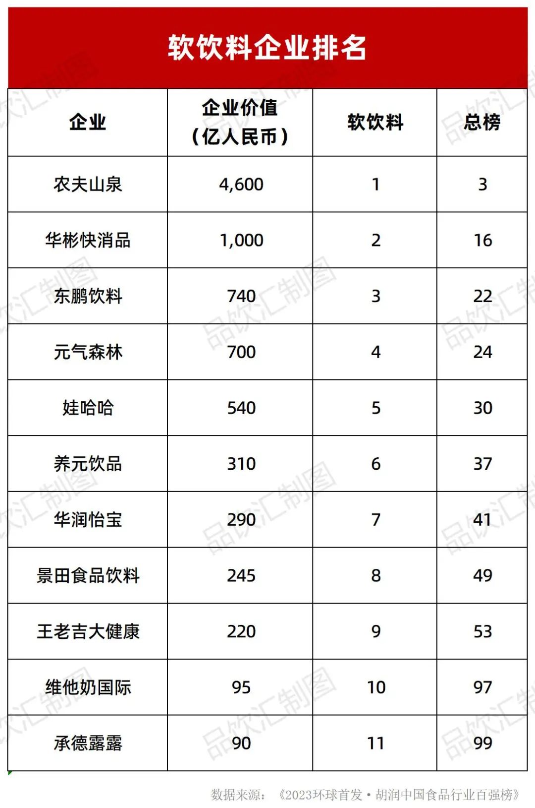 其中農(nóng)夫山泉以4600億企業(yè)價值排名總榜第3名,軟飲料第1名;華彬快消品、東鵬飲料以1000億/740億企業(yè)價值排名總榜第22名及24名;元氣森林以740億企業(yè)價值排名總榜第24名,軟飲料第4名,也是總榜單中最年輕的上榜品牌。