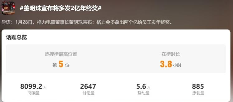而董明珠更是在格力“2024全球夢想盛典”上公開宣布,會多拿出2個億給員工發(fā)年終獎。相關(guān)話題一度沖上了微博熱搜,羨煞不少網(wǎng)友。