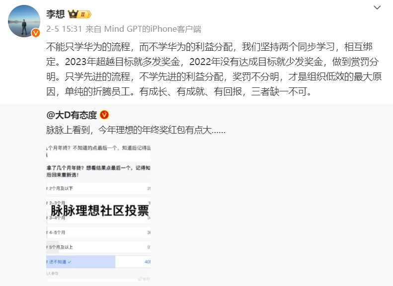 對此,理想汽車CEO李想還在微博上回應(yīng),稱“不能只學(xué)華為的流程,不學(xué)華為的利益分配。2023年超越目標(biāo)就多發(fā)獎金,2022年沒有達(dá)成目標(biāo)就少發(fā)獎金!