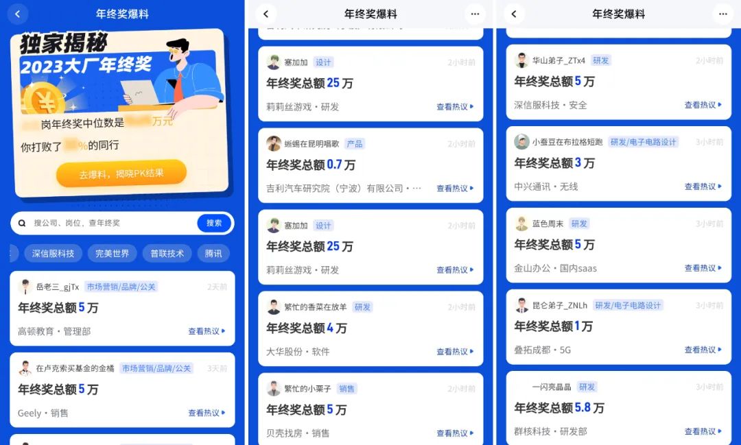 職場社區(qū)“脈脈”特別推出了“年終獎爆料”板塊,用戶可以主動分享自己所在的公司、崗位以及年終獎情況,供其他網(wǎng)友參考。