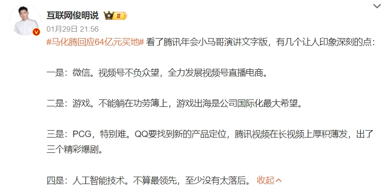 而不久前騰訊的年會上,微信視頻號剛剛獲得了馬化騰的高度贊揚;其表示視頻號的發(fā)展不負(fù)眾望,“讓我們在過去短視頻失利的情況下,重新具備了一個堅實的抓手。”同時,馬化騰也傳遞出騰訊今年還將全力發(fā)展視頻號直播電商的信號。