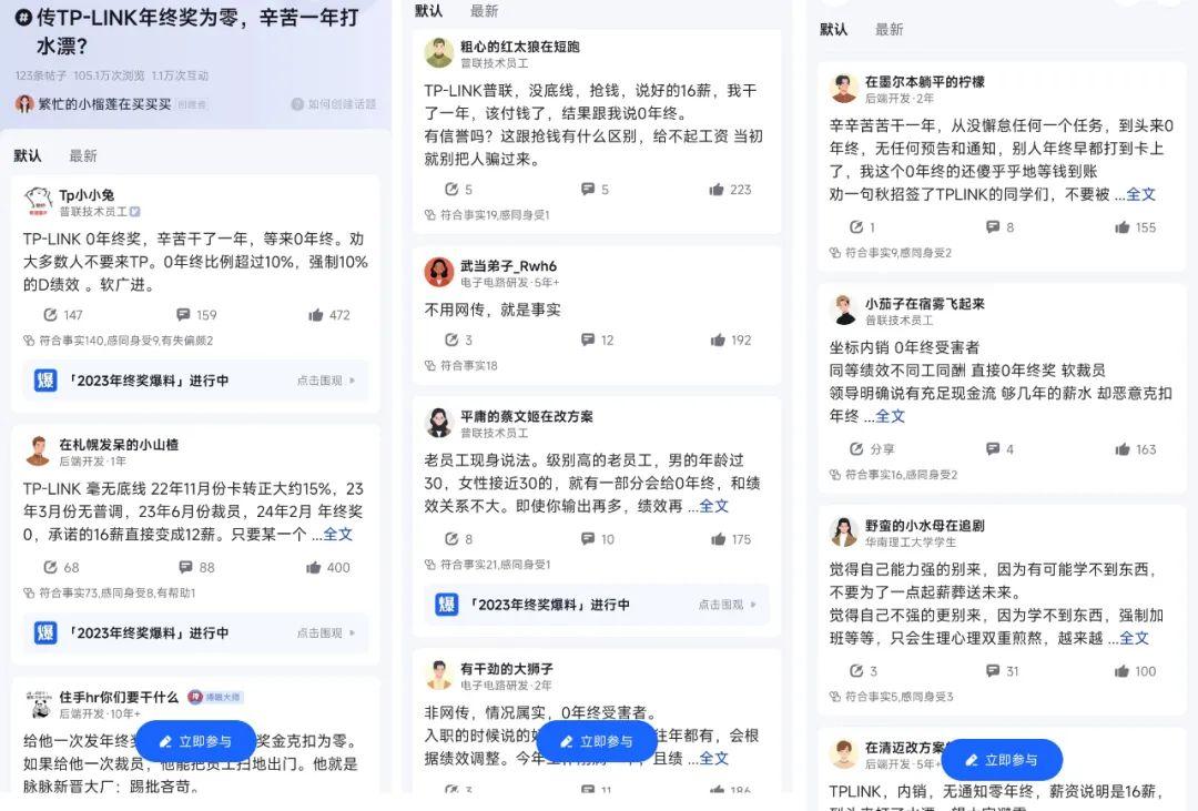 脈脈平臺上,“傳TP-LINK年終獎為零,辛苦一年打水漂?”的話題一度成為熱榜第一。多位網(wǎng)友在話題下發(fā)聲吐槽,稱傳言為真;截至2月8日上午,該話題已有超105萬次瀏覽,1.1萬次互動。