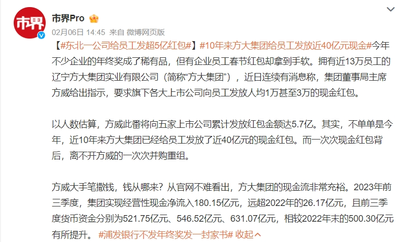 方大集團(000055.SZ)的“大禮包”也是不遑多讓。近日有媒體報道稱,方大集團董事局主席方威給出指示,要求旗下各大上市公司向員工發(fā)放人均1萬元至3萬元的現(xiàn)金紅包;以人數(shù)估算,方威此番將向五家上市公司累計發(fā)放紅包金額達(dá)5.7億。
