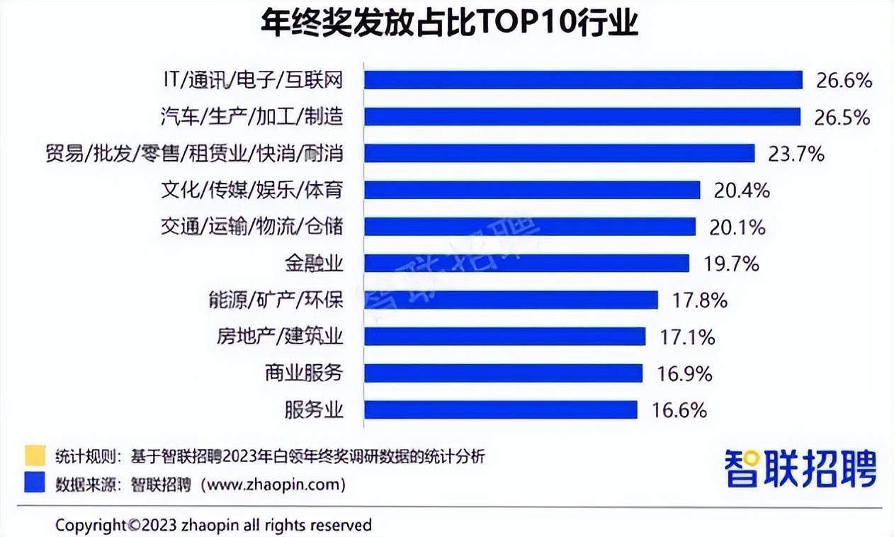 其中,IT/通訊/互聯(lián)網(wǎng)行業(yè)白領(lǐng)年終獎發(fā)放占比為26.6%,位居所有行業(yè)第一;緊隨其后的是汽車/生產(chǎn)/加工/制造行業(yè),年終獎發(fā)放占比26.5%;最低的服務(wù)業(yè),年終獎發(fā)放占比僅16.6%。