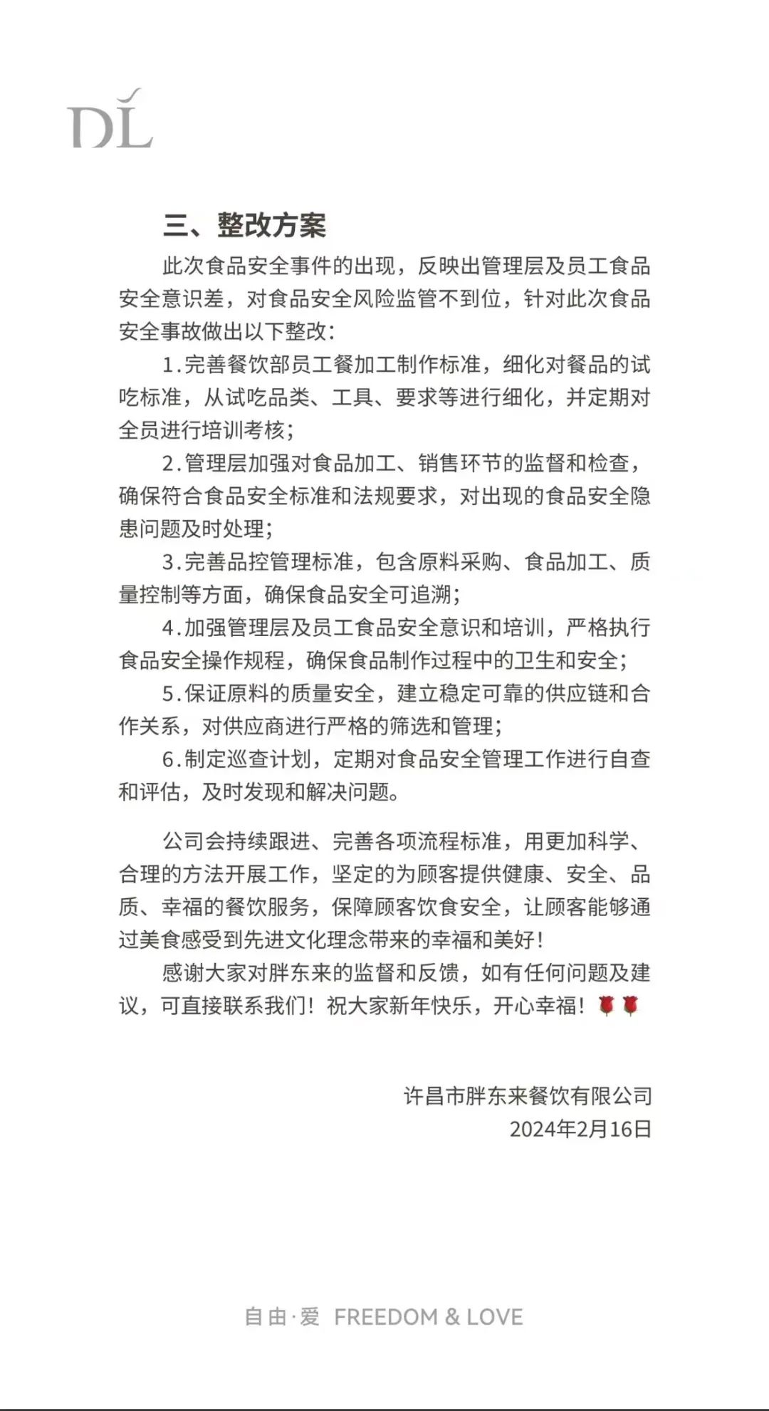 感謝大家對(duì)胖東來的監(jiān)督和反饋,如有任何問題及建議,可直接聯(lián)系我們!祝大家新年快樂,開心幸福!