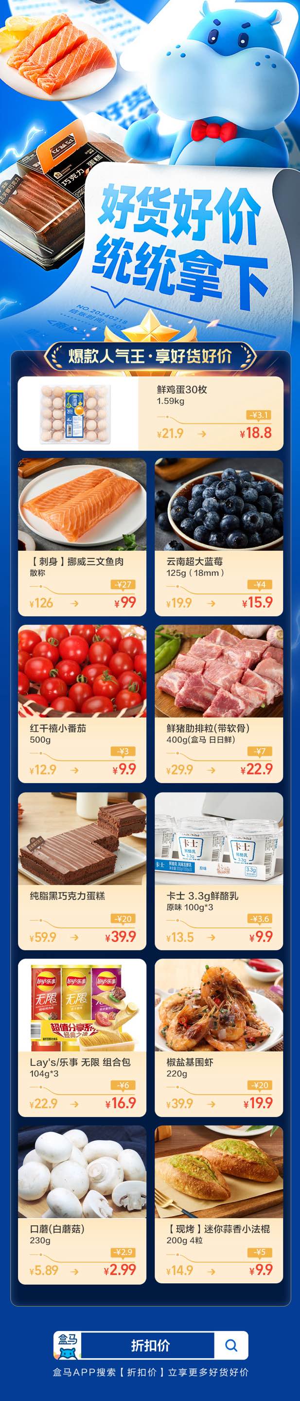 盒馬方面表示,春節(jié)過后,盒馬在三個試點城市內(nèi)實行新舉措:盒馬商品價格普遍下調(diào),降價動作覆蓋海鮮水產(chǎn)、肉類禽蛋、蔬菜水果、烘焙、休閑食品、酒類等幾乎所有品類,消費者將長期享受好物好價。