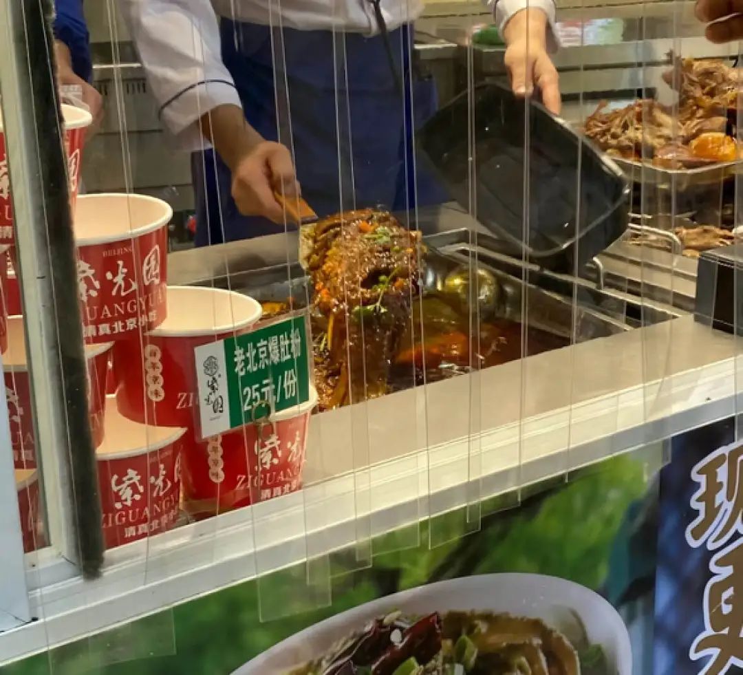 即使這份煙火氣有演戲的成分。紫光園重點向你展示煙火氣的地方叫做小吃檔口,主要售賣鹵肉和面食。有只做檔口的店,也有正餐和檔口都有的店,這個玻璃背后的一畝三分地明明白白地向你展示員工的一舉一動,內(nèi)部稱做第二增長曲線。