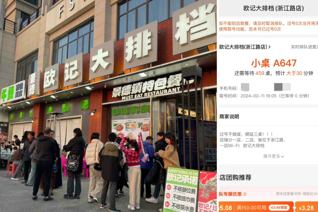 江西景德鎮(zhèn)的特色餐飲“歐記大排檔”,同樣是從初一“擠到”初六,單日排位接近700號。