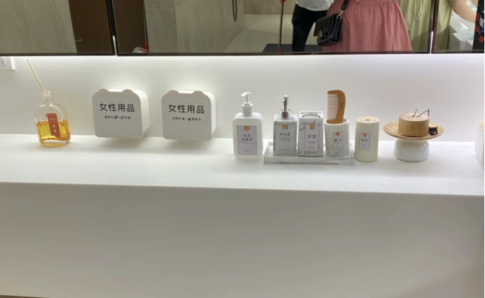 號(hào)稱斥資上百萬(wàn)的洗手間里,水龍頭都是戴森洗吹一體的款式,洗手臺(tái)上放著棉簽、護(hù)手霜、發(fā)卡、小梳子,還貼心地準(zhǔn)備了女性用品。類似的細(xì)節(jié)還有很多,比如說(shuō)橙子旁邊放著剝皮器,飲料、醬油醋、熟食等產(chǎn)品旁邊配有放大鏡,冷凍柜上面掛著防低溫硅膠手套,塑料袋為了拿取方便,配了濕手器。