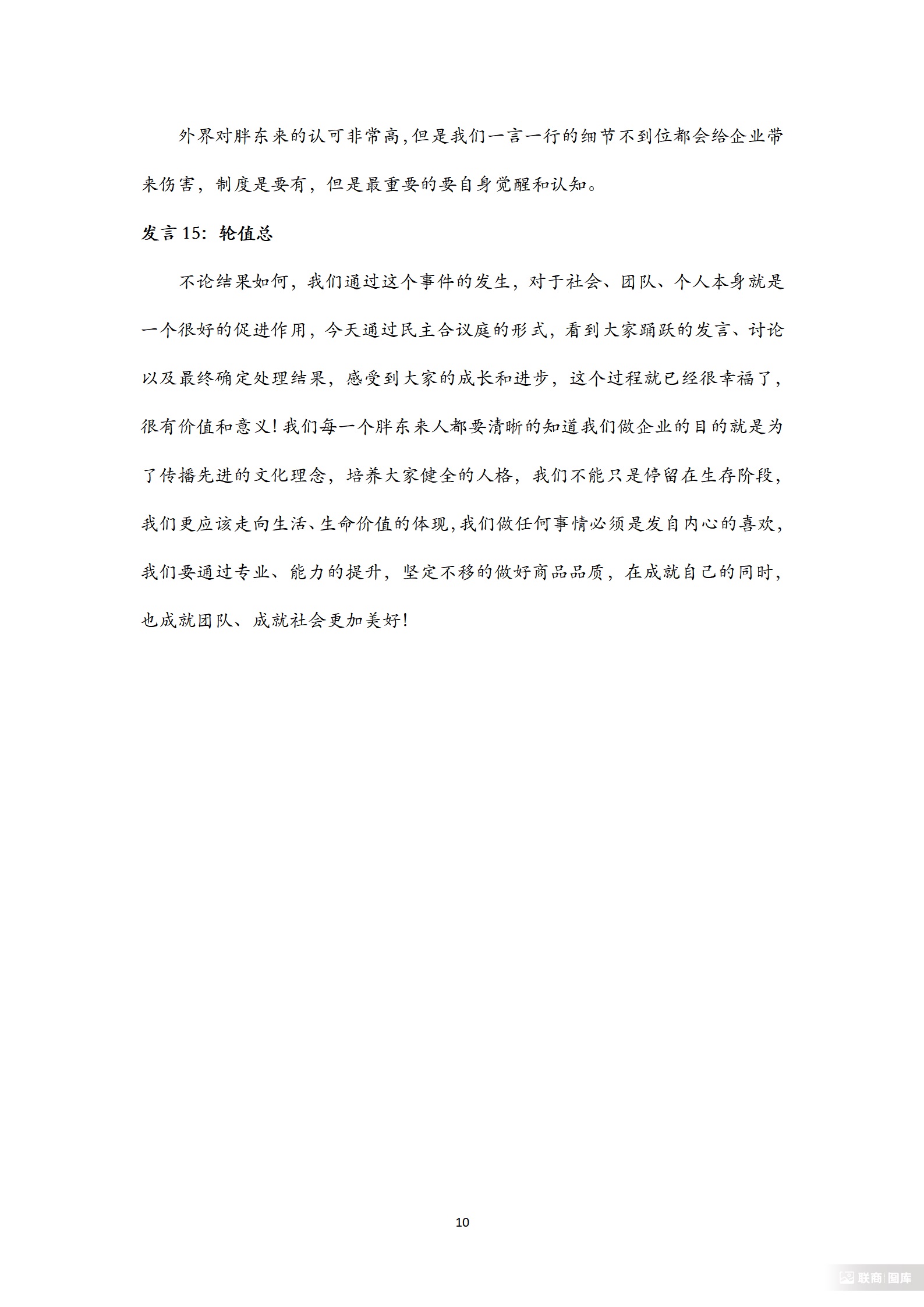 此份決議,詳細(xì)介紹了民主評議的參與人員、評議流程、現(xiàn)場陳述記錄、評議結(jié)果、調(diào)整方案等等。從事件的來龍去脈,到處理結(jié)果,事件鏈條清晰完整,胖東來已經(jīng)有一套非常清晰,并且行之有效的標(biāo)準(zhǔn)制度流程。當(dāng)然,這一最終處理結(jié)果,體現(xiàn)了胖東來充分尊重消費者及社會民眾的意見,同時也體現(xiàn)了胖東來嚴(yán)格的制度標(biāo)準(zhǔn)和流程機(jī)制,以及充滿人性化的民主制度。