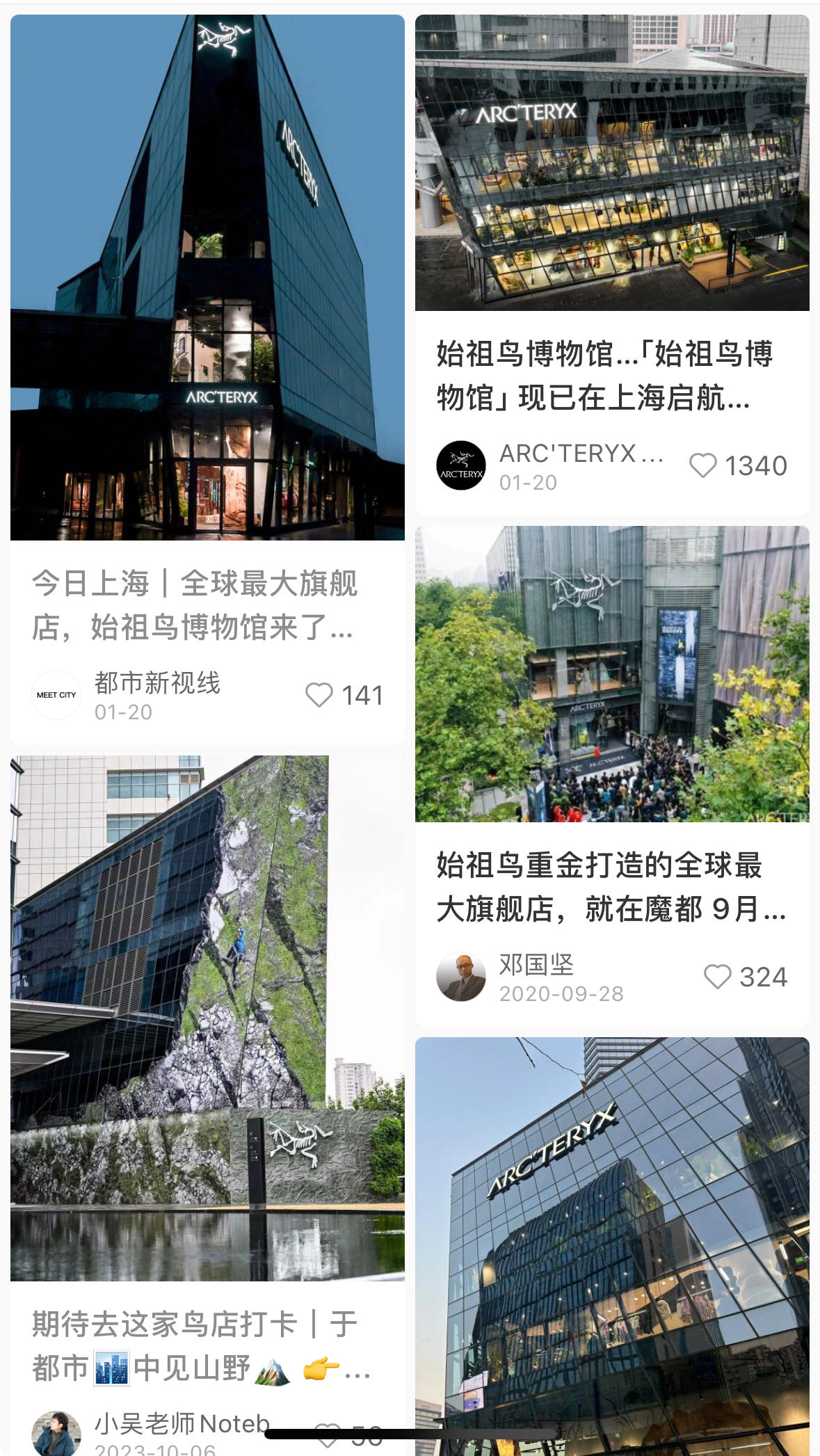 這種天然具有話題度的場景和服務(wù),也成為了用戶在社交平臺的談資,大量 UGC因此被創(chuàng)造。和此前成都太古里的三星堆式旗艦店類似,這家全球生態(tài)旗艦店一開業(yè),便在小紅書、抖音形成話題,許多戶外愛好者紛紛錄制打卡 vlog 或圖文探店帖子。