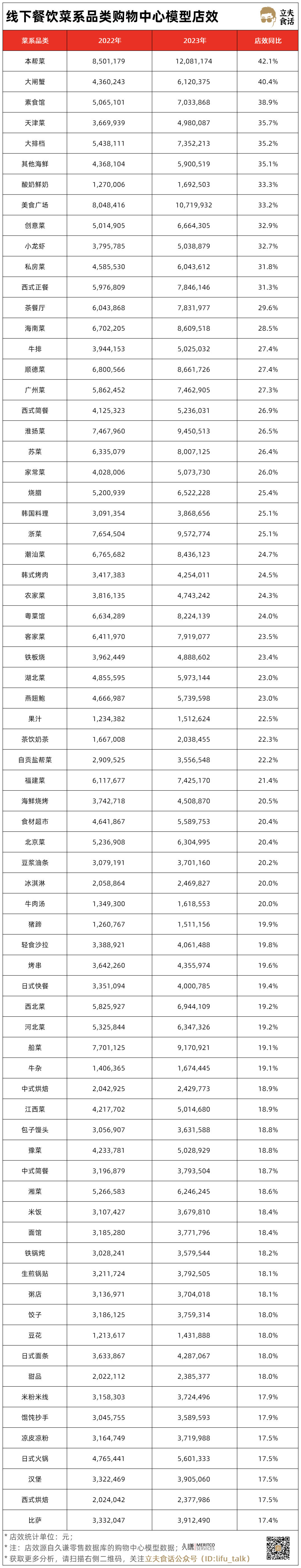 里面是2022與2023年購物中心餐飲的72個細(xì)分類目模型店效。