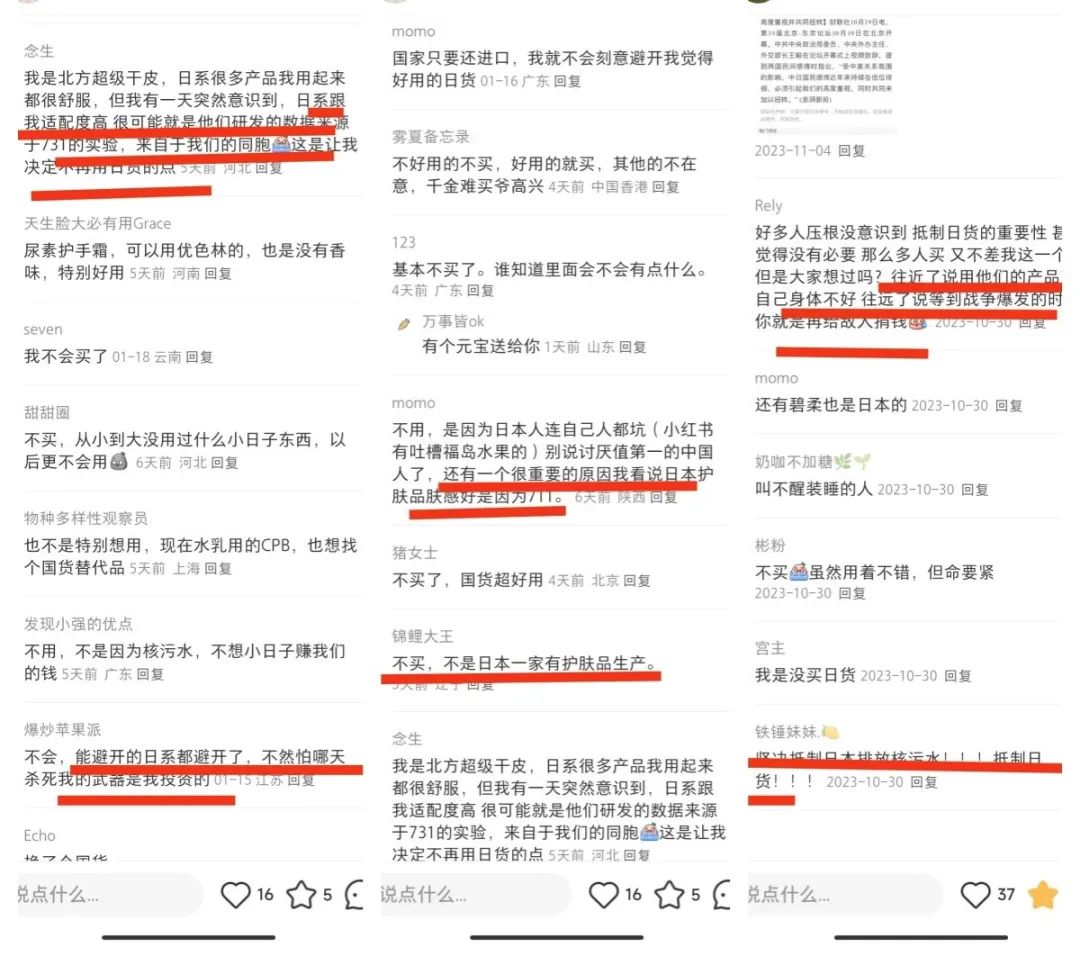 在小紅書上,搜索“SK-II”,可以發(fā)現(xiàn)自核污水排放后,很多用戶自發(fā)抵制日系護膚品牌,并形成了尋求替代品的潮流。一位用戶稱,“我換護膚品不是怕輻射,就是覺得這事太不地道了,自此后打算換掉所有日貨,不讓日本賺我的錢”,這種心理反映出不少國人的消費理念。