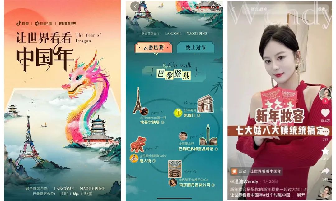 “讓世界看看中國(guó)年”就是蘭蔻、毛戈平、溪木源、hfp等美妝品牌聯(lián)合抖音打造的文旅營(yíng)銷活動(dòng);顒(dòng)期間,平臺(tái)邀請(qǐng)眾多達(dá)人以城市漫游的形式,如打卡莎瑪麗丹百貨公司、法國(guó)時(shí)尚博物館等,來(lái)潛移默化地展現(xiàn)品牌新年系列產(chǎn)品的獨(dú)特氣質(zhì)。